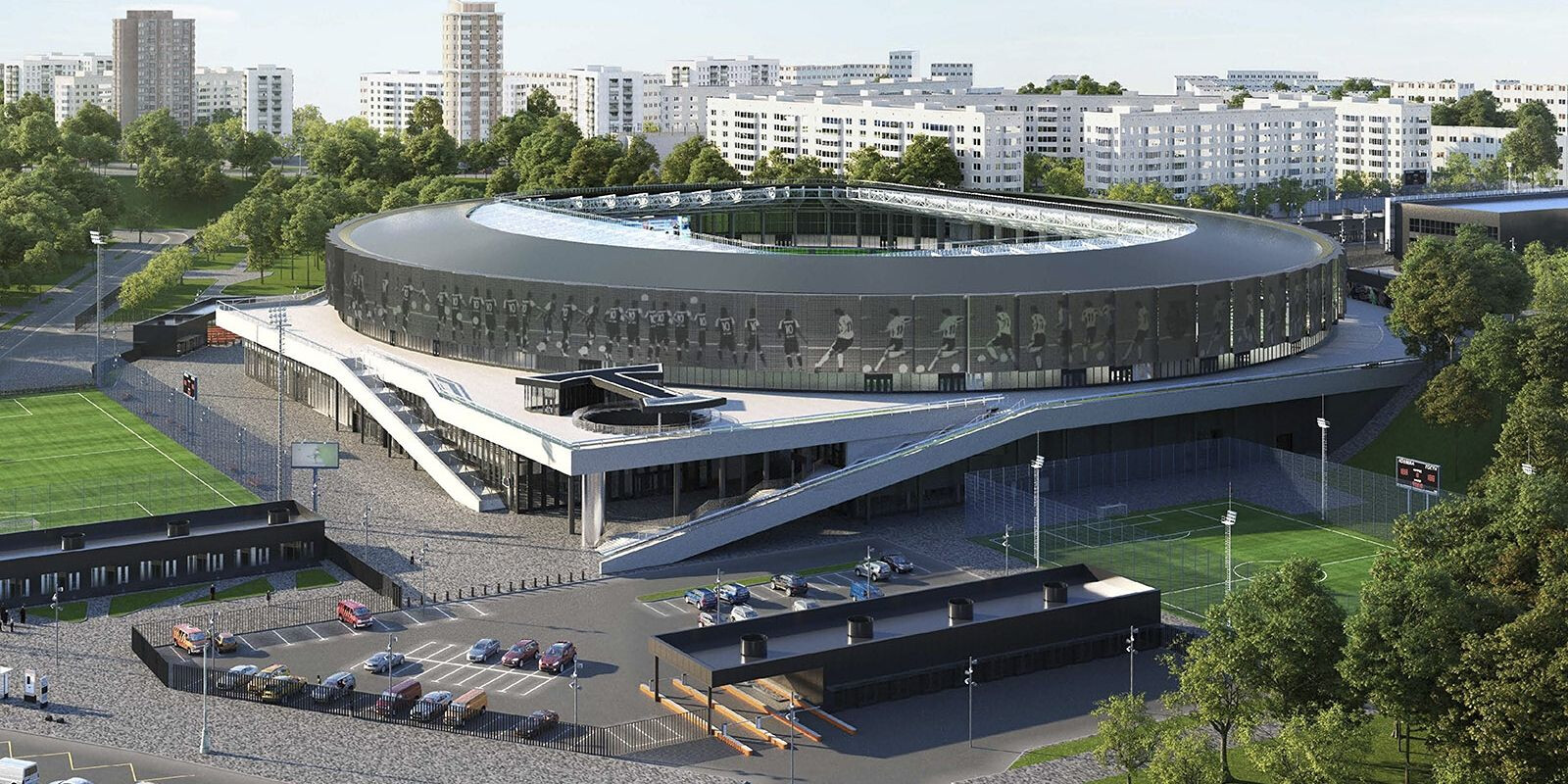 Основной объем стадиона состоит из стального кольца, напоминающего шестеренку, обрамляющего арену и возвышающегося над нижней стилобатной частью. Стальное овальное кольцо, выполненное из навесного фасада с облицовкой перфорированными панелями, перекликается с велосипедной звездочкой — одним из элементов неизменной символики клуба